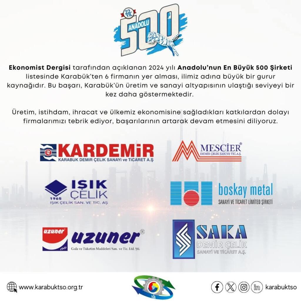 Konu ile ilgili, “Ekonomist Dergisi tarafından açıklanan 2024 yılı Anadolu’nun En Büyük 500 Şirketi listesinde Karabük’ten 6 firmanın yer alması, ilimiz adına büyük bir gurur kaynağıdır. Bu başarı, Karabük’ün üretim ve sanayi altyapısının ulaştığı seviyeyi bir kez daha göstermektedir.