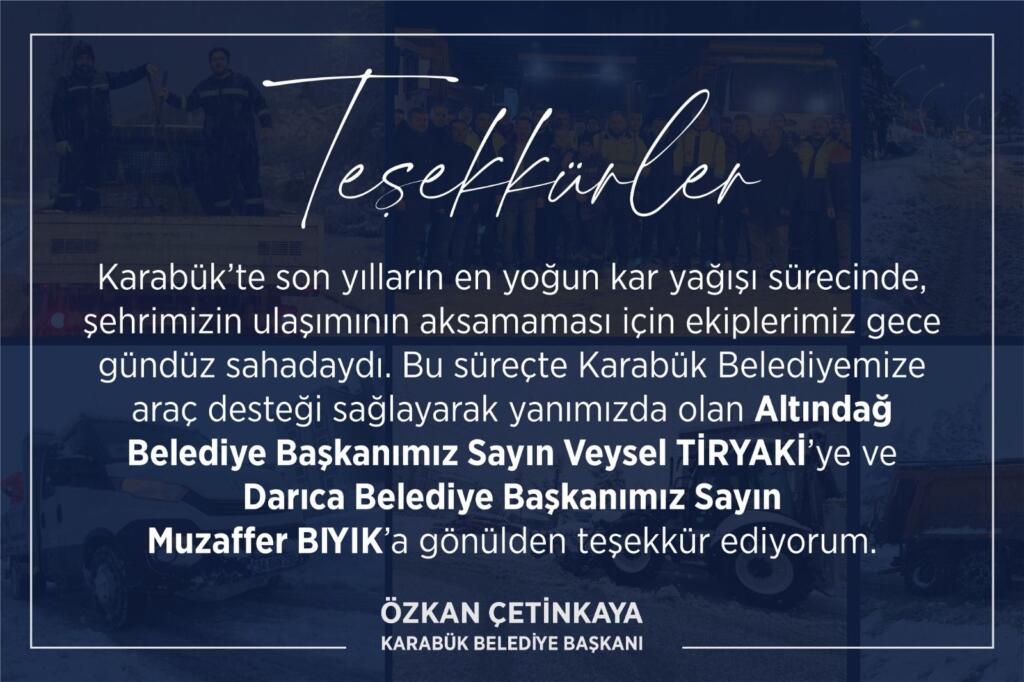 “Yoğun kar yağışının etkili olduğu bu süreçte Karabük Belediyesi olarak tüm ekiplerimizle sahadaydık. Bu süreçte araç desteği sağlayarak yanımızda olan Darıca Belediye Başkanımız Sayın Muzaffer Bıyık’a ve Altındağ Belediye Başkanımız Sayın Veysel Tiryaki’ye gönülden teşekkür ediyorum. Yerel yönetimler arasındaki bu dayanışma, kardeşlik ruhunun ve güçlü iş birliğinin en güzel örneklerinden biridir.”